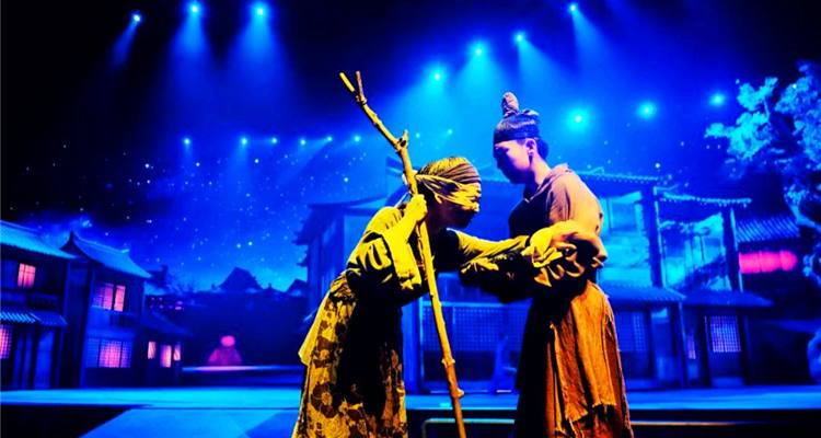 在《驼铃传奇》秀的第一幕送君千里中,驼工们在远行前,他们的妻子都会给其沐浴更衣。这一幕中出现了令人惊艳的可以自由开合的房屋,房屋底盘的舞台机械使用可谓巧夺天工。