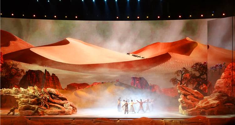 盛唐的历史文化卷轴在徐徐打开,历史再次重演,漫漫沙漠、声声驼铃、盛唐民俗、生活都在大屏幕上逐一展现,置身其中,仿若再次回到盛唐