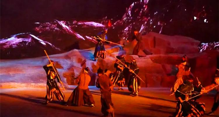 在《驼铃传奇》秀的第二幕狼道遇险中,驼工们不畏凶险,知难而进,遭遇了火山爆发的自然天灾。火红的岩浆爆裂加上旋转的机械设备,令人赞不绝口。