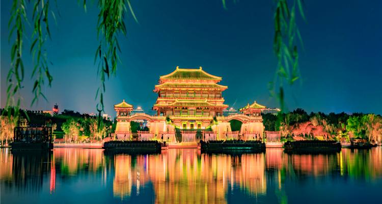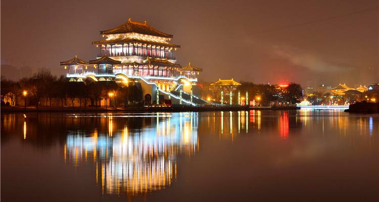 大唐芙蓉园位于古城西安东南曲江新区,占地1000亩,其中水面300亩,是中国第一个全方位展示盛唐风貌的大型皇家园林式文化主题公园。全园景观分为十二个主题文化区域,从帝王、诗歌、民间、饮食、女性、茶文化、宗教、科技、外交、科举、歌舞等方面全面展现了大唐盛世的灿烂文明。